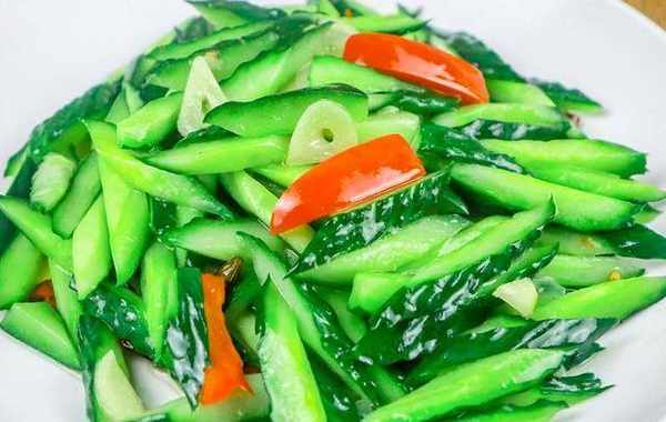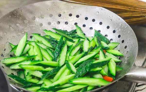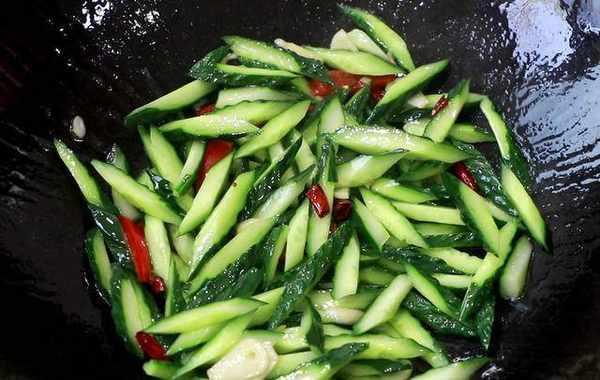 3.锅内烧油,油烧热以后倒入蒜片,加入几粒干辣椒翻炒出香辣味,把控过水分的黄瓜倒入锅中,快速翻炒让黄瓜均匀裹上油,避免黄瓜与食盐直接接触,造成黄瓜出水影响口感。