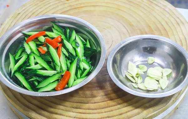 1.准备洗净的黄瓜三根,切掉两头把黄瓜破开,去除瓜瓤斜刀切成段。红椒一片切成小段,大蒜几粒切成片。