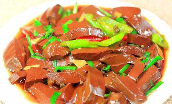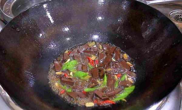 3.热锅凉油,放入青椒片煸炒至断生,盛出来备用。然后放入姜蒜、小米椒和青花椒,开小火炒出香辣味,接着倒入鸭血和青椒,加入食盐2克,胡椒粉2克,白糖少许提鲜,生抽5克,蚝油5克,老抽2克调色,沿锅边加入一勺清水,大火烧开以后转小火煨2分钟把鸭血煨至入味。