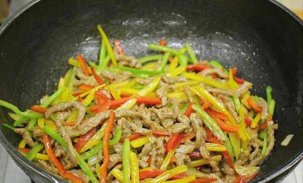 1.鲜牛肉一块,切成细丝放入盆中,加入适量的盐、鸡粉、胡椒粉、蚝油、生抽,准备好的葱姜料酒水也倒进去一些,顺着一个方向快速的搅打,磕进去一个鸡蛋清继续搅拌,再放入一小撮淀粉锁住水分,最后用油封一下腌制10分钟。黄椒、红椒以及青椒,全都切成细丝。