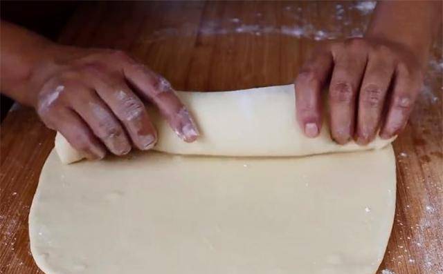 2、揉好面团后,不要再用了。案板上撒干面粉,把面团直接放在上面用手压一下,然后擀成薄薄的面团状的面团,抹上油,撒上干面团。他。面粉,从一端慢慢滚动到另一端。