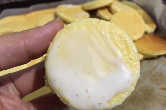 9、晾凉,用杯子压成圆圈,涂上沙拉酱。