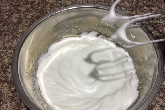 5、蛋白分三次加糖打发,打至打蛋器提起弯钩状态即可。