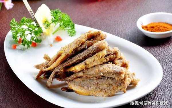 4、将火调回大火,待油温重新升高到八九成热(油里冒泡泡)时,将小黄鱼放进,大火复炸至表面金黄,即可捞出,与椒盐、鸡酱一同上桌。