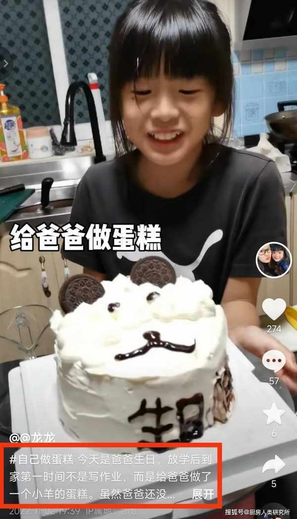 在爸爸生日当天,放学后她便直奔厨房,比写作业更重要的是给爸爸做蛋糕。