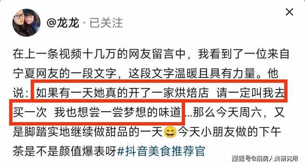 “ 如果有一天,龙龙真的开了一家甜品店,请一定叫我去买一次,我也想尝一尝梦想的味道。”
