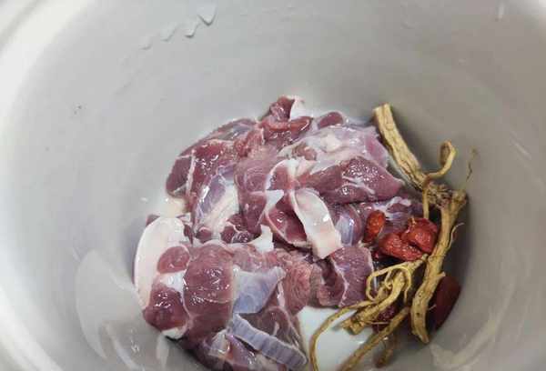 3、姜洗净切片,准备一个干净的锅,锅里放上筋肉,放党参和枸杞,放姜片。起到去腥、提鲜的作用;