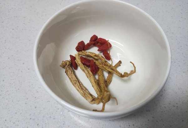 2、党参和枸杞洗净,可以加点面粉洗,这样洗的更干净。洗净后,枸杞放一旁,党参切成小块放入碗中;
