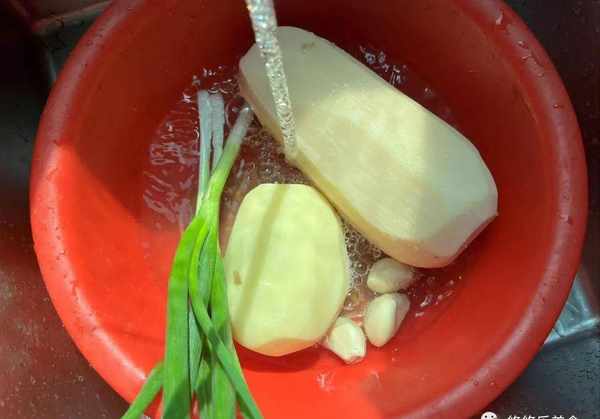 1、将准备好的土豆放入水中洗净皮,洗净后用削皮刀将土豆的皮削掉。去皮后用清水洗净,小葱去头去尾,去后用水洗净。将洗净的小葱放一旁,将大蒜拍碎放在案板上,去掉蒜皮;