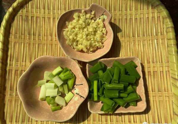 小葱静置切段,小葱和大葱要分开。将大蒜剁成蒜泥,蒜末放入锅中待用;