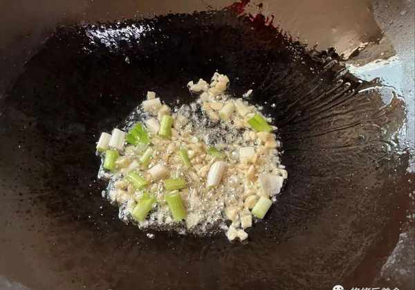 4、将蒜末和葱段倒入锅中。材料入锅后,开小火炒香。炒的时候把铲子稍微转动一下,这样炸得更好;