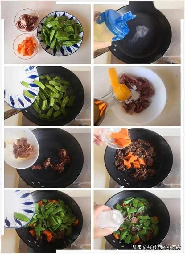 制作:1. 准备好食材; 2. 烧锅水加入盐和油; 3. 加入焯好的荷兰豆进锅焯至变色后捞出备用; 4. 牛肉片加入盐、淀粉、生抽、料酒和姜末等调味料拌均匀后腌制一下; 5. 热锅凉油,加入牛肉片进锅翻炒变色; 6. 加入准备好的胡萝卜片进锅翻炒两下; 7. 加入 荷兰豆进锅翻炒几下; 8. 最后加入适量的盐调味翻炒均匀即可。
