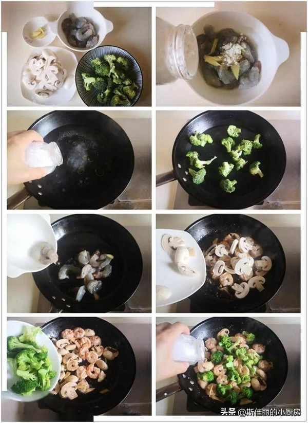 原料: 虾仁 西蓝花 口蘑 姜末 料酒 淀粉 油盐