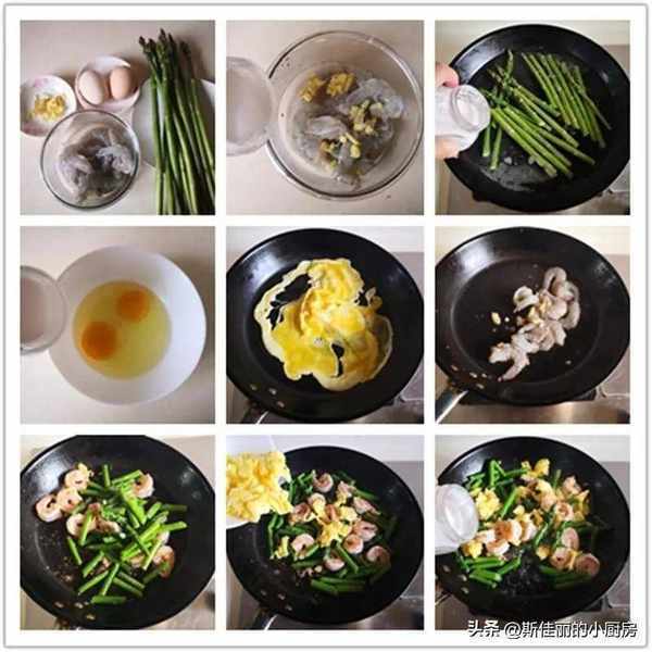 制作:1. 鲜大虾去壳后挑出虾线后处理干净备用; 2. 虾仁加入少许盐、料酒、淀粉和姜末等调味料拌均匀; 3. 烧锅水加入少许盐和几滴油, 将整根芦笋放进锅中烫变色后捞出切成小段; 4. 鸡蛋加入1小勺盐打散备用; 5. 热锅凉油,倒入蛋液进锅煎至定型后翻炒成小块先盛出备用; 6. 锅中少许油,放入虾仁进锅翻炒至变色后; 7. 加入芦笋进锅翻炒; 8. 加入炒熟的鸡蛋进锅翻炒; 9. 最后加入少许盐翻炒均匀即可。