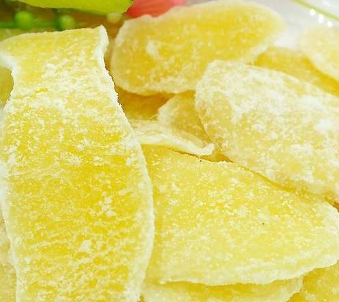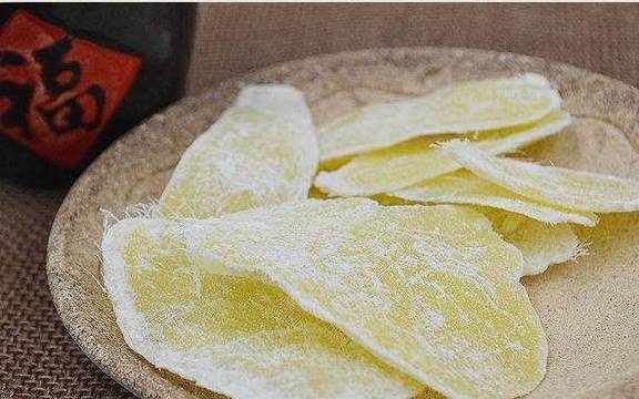 糖姜片乃用鲜姜拌白糖晒制而成,其状洁白清亮,晶莹剔透,其味辛辣、甘甜。健康者食之开胃生津,胃痛胃寒者食之止痛祛寒暖胃。有疏络通经,活血化瘀之效。