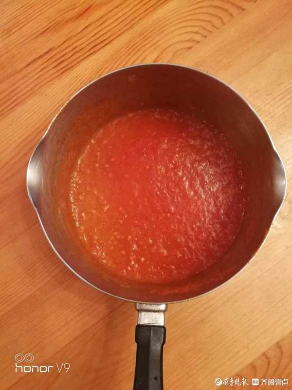 3、自己做的番茄酱,无添加,吃着放心,两个西红柿,去皮切丁,放搅拌机打碎,放锅里慢火熬,加一块冰糖,少量盐,熬制粘稠就可以了,备用。