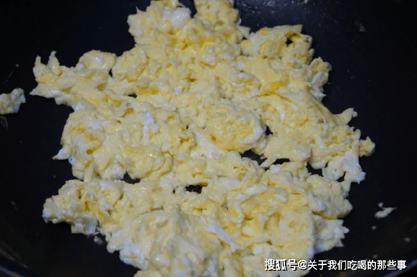 2、鸡蛋打入碗中,加入食盐、清水搅拌均匀。起锅烧油,八成热时倒入鸡蛋液,大火煎至定型,颜色金黄后炒成大块,盛出备用。