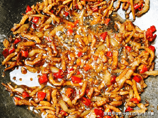 2、起锅烧油,放入腌好的肉丝,中火炒至变色,放入料酒去腥,下姜蒜炒香。放入生抽翻炒上色,放入干辣椒段继续炒香。