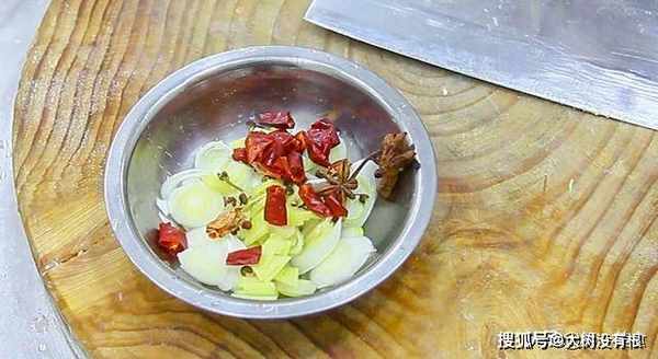 大葱一段,斜切成片,生姜一块切成菱形片,一小撮花椒,两粒八角,一把红干椒。