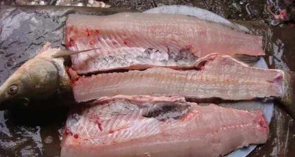 鱼包肉:鱼肉和做鱼丸差不多,皮没有经过处理。切的时候,鱼皮的一面朝下。第一部分大约一英寸厚。第二次切割是相同的厚度和切割。传播它两个多月。切口越薄越好。包肉的时候,鱼皮的一面是肉饼。