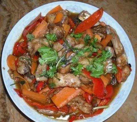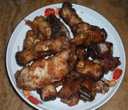 炸鱼:将鱼背上的去皮大骨肉与土豆粉、盐、鸡精混合,用70%的热油在平底锅中炸至金黄。香脆可口。