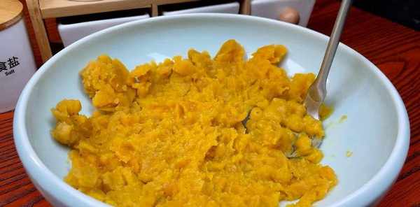 红薯蒸至软烂后,放入锅中,加少许水,捣成细密的红薯混合物,倒入大碗中。
