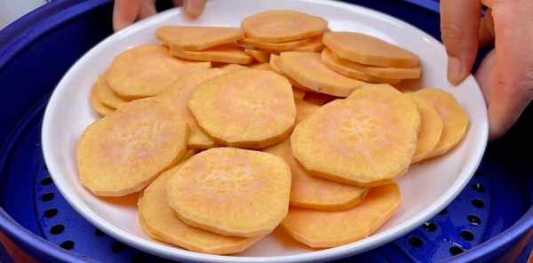 准备红薯一个,去皮,切成薄片,放在大盘子里,用手摊匀。