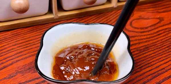 面团发酵好后,准备一个小碗,加入两勺黄豆酱,加入食用油用筷子拌匀。