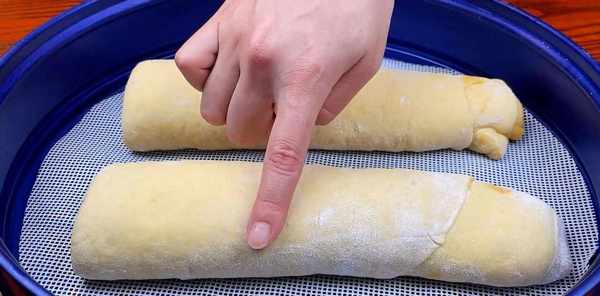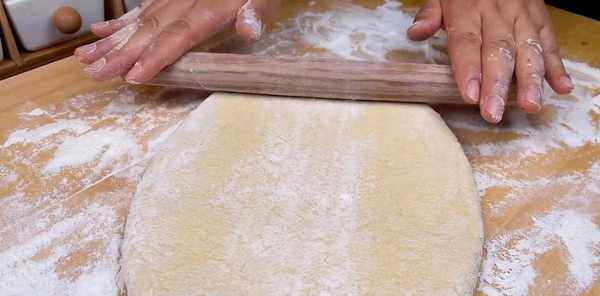 将面团移至暗板上继续揉面,不要抬起面团。揉好后排成圆形,用手压扁撒上干面粉,然后用擀面杖擀成一个长方形的大面团。
