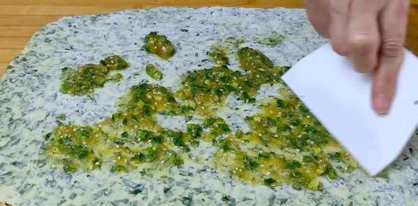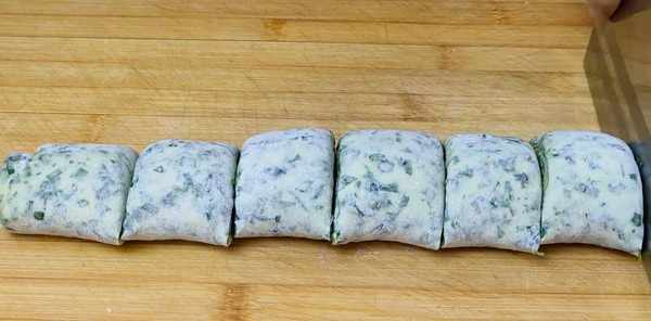 把调好的油酥放在上面,用刮刀刮匀,把葱卷起来边压边,排掉里面的空气,把边弄平,用刀切成均匀的面团。