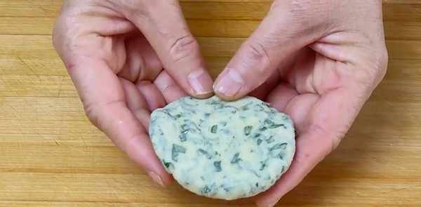 取一剂,用力压口,最后排成一圈,放在案板上压成一个小圆饼。