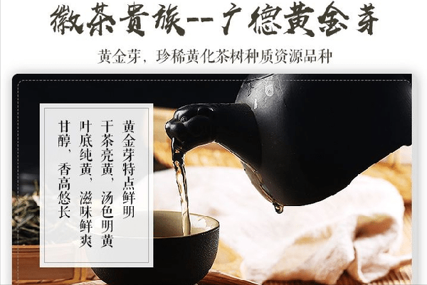 广德黄金芽茶由广德区域内引种及自主繁育的无性系黄化变异茶树品种制成的绿茶。2019年10月,广德市被安徽省确立广德黄金芽茶特色农产品优势区。优越的资源禀赋、精准的政策举措、饱满的市场活力、不断进取的职业精神,推动广德黄金芽产业高速发展,形成特色农产品优势区。