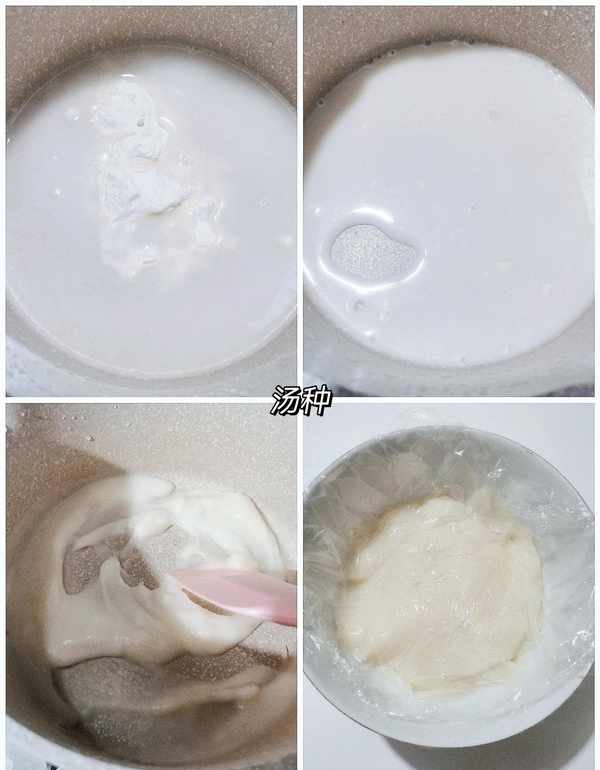 1.先制作汤种,汤种的面粉和水放入不粘锅,搅拌均匀,开火不停搅拌,直至面粉糊化粘稠,关火,倒入碗中,表面贴保鲜膜等待冷却