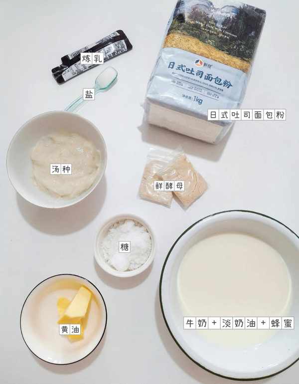 食材:汤种→日式吐司面包粉15克、水75克、主面团→日式吐司面包粉360克、鲜酵母12克、盐5克、糖26克、蜂蜜14克、炼乳13克、淡奶油25克、牛奶204克、黄油30克