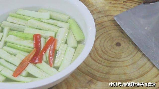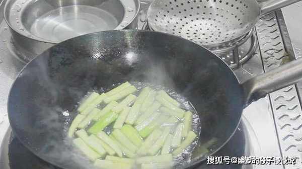 锅内烧水,水里加入少许植物油,水开后倒入丝瓜条,焯水30秒倒出。水里加点植物油的目的,是