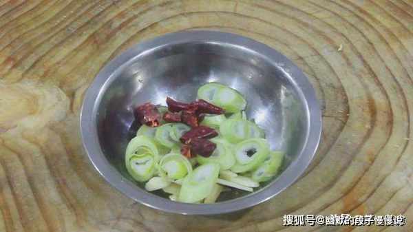 姜斜切成片,大蒜切成碎片,大葱白斜切成圈,再加入一把红干椒。