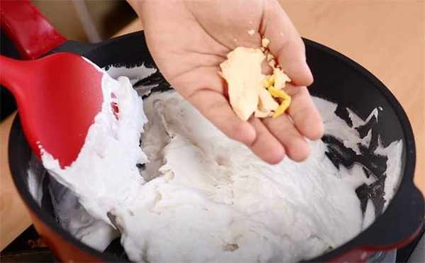 2.炒粉糊的时候我们全程小火,不停的搅拌,慢慢的随着温度的升高,粉糊会变得越来越粘稠,这时候我们放一些黄油。