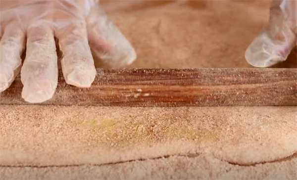 4.在桌面铺上一层熟的黄豆粉,把糯米粉团重新整理好形状之后擀成饼皮。