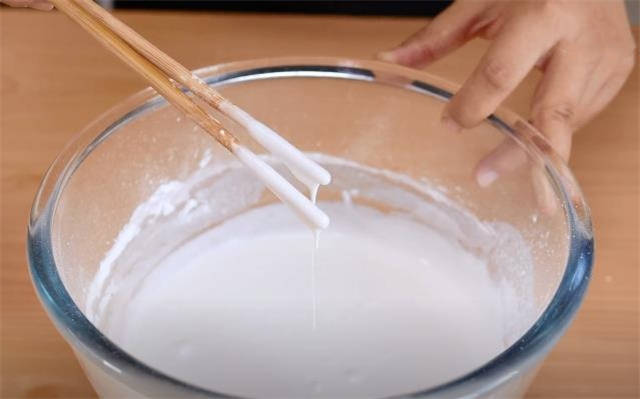 1.先倒入250g的糯米粉,和面的时候直接用220g的清水,糯米粉没有筋性,所以说搅拌起来也不会很费力,最后一直到这种很稀释的状态就可以了。