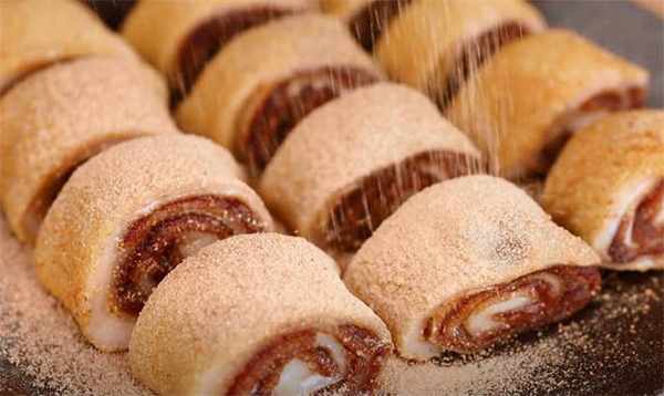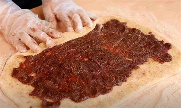 5.中间的馅料部分我们挤上一些豆沙馅,把馅料抹平了就可以从底部卷起来了。