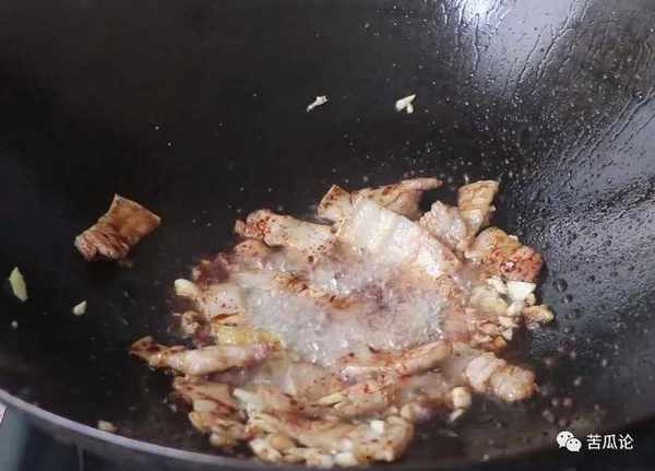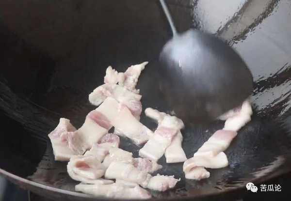 2、接着准备三块钱的肥猪肉,将它放在锅中煎出猪油。