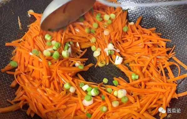 3、继续热锅放油,倒入胡萝卜丝,快炒至断生。放食盐,生抽调味,加点清水湿润。再撒点葱花、蒜末进去,炒出香味。