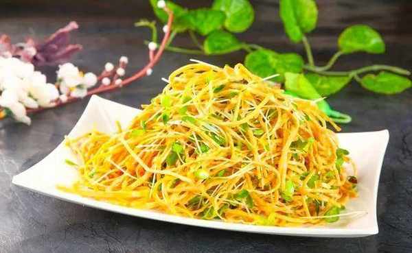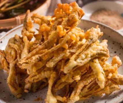 4、起锅倒入适量的油,油约5成热时,用筷子夹香椿入锅,待定型后,炸至微黄,即可出锅,后撒入适量的花椒盐,味道更佳。