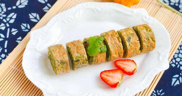 6、将鸡蛋饼铲出,卷成长筒状,然后切成均匀的小段即可。