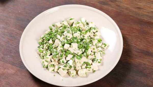 4、将香椿和豆腐一起放进盘种,加入适量的盐,淋入适量的芝麻油,搅拌均匀入味即可。
