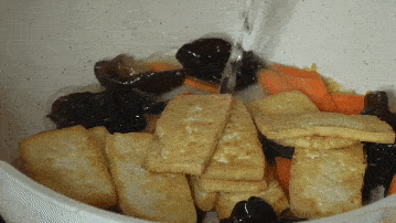 1.食材准备:老豆腐切块、胡萝卜去皮切片、木耳提前泡发撕成小块、腐竹提前泡发
