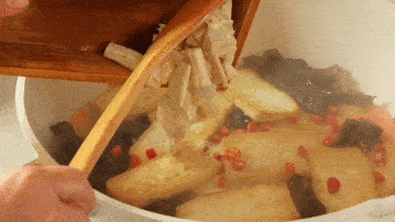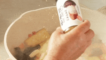 7.放入泡发好的腐竹,加适量松茸调味料和松茸一品鲜调味