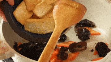 5.下入煎好的豆腐,加适量清水炖煮,将木耳和胡萝卜的味道融入豆腐中