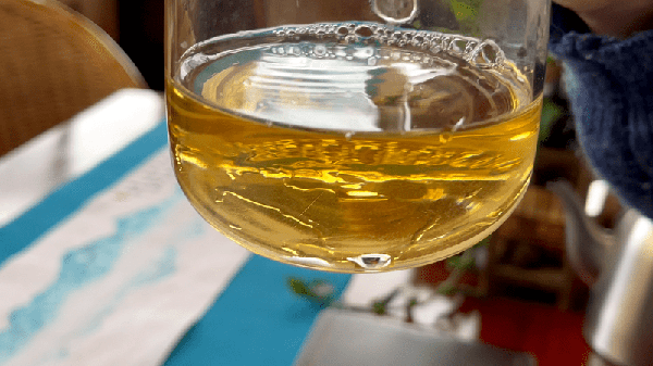 尾水阶段,已经十几泡的茶,这款茶的话耐泡度还是很好的,我们现在10多泡可以看一下这个汤色依然还是明黄的透亮的。