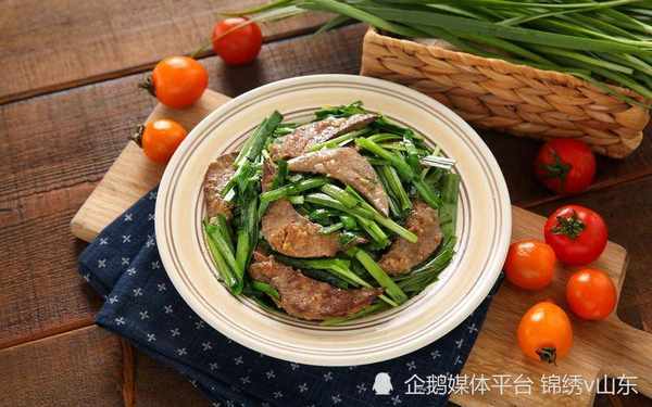 3.锅里留底油,下姜片、蒜片、小米辣圈和韭菜节炒香后,倒入猪肝片,边炒边烹入用辣鲜露、酱油、盐、味精、白糖、胡椒粉和湿生粉对成的碗芡,待其收汁便可装盘。
